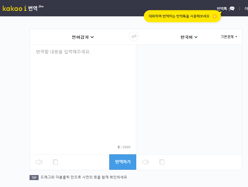 ์นด์นด์ค์์๋ ๋ฒ์ญ๊ธฐ ์๋น์ค๋ฅผ ์ ๊ณตํ๊ณ ์์ต๋๋ค. ํํ์ด์ง(https://translate.kakao.com)์ ํตํด์ ๋ฒ์ญ๊ธฐ๋ฅผ ์ฌ์ฉํ ์ ์์ต๋๋ค. ์นด์นด์คํ๋ฉด ์นด์นด์คํก์ด ๋ ์ค๋ฅด์ฃ . ๋ฒ์ญํก์ ํตํด ๊ฐ๋ณ๊ฒ ๋ชจ๋ฐ์ผ์์ ์ฌ์ฉํ ์ ์๋ค๋ ์ฅ์ ์ด ์์ต๋๋ค.